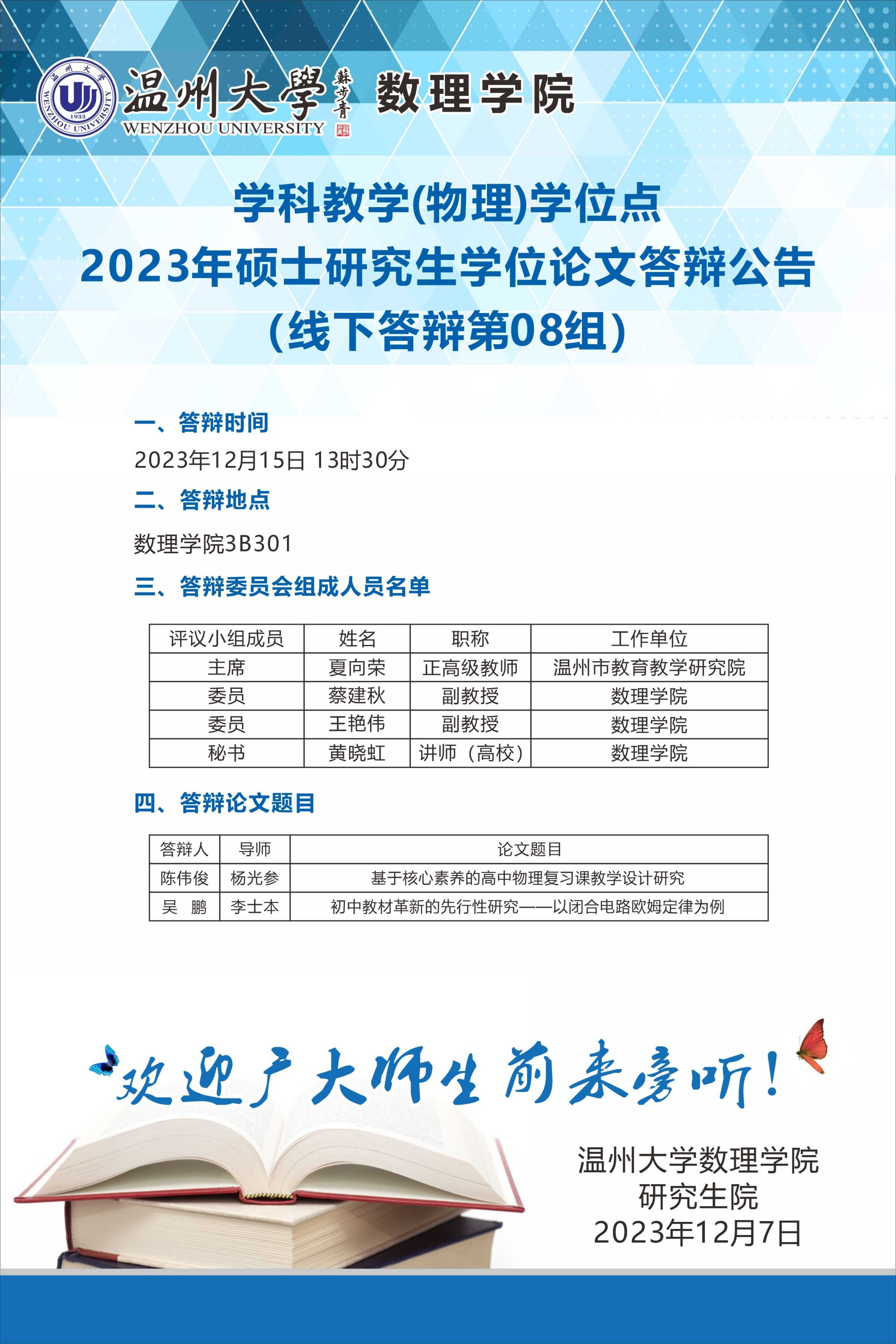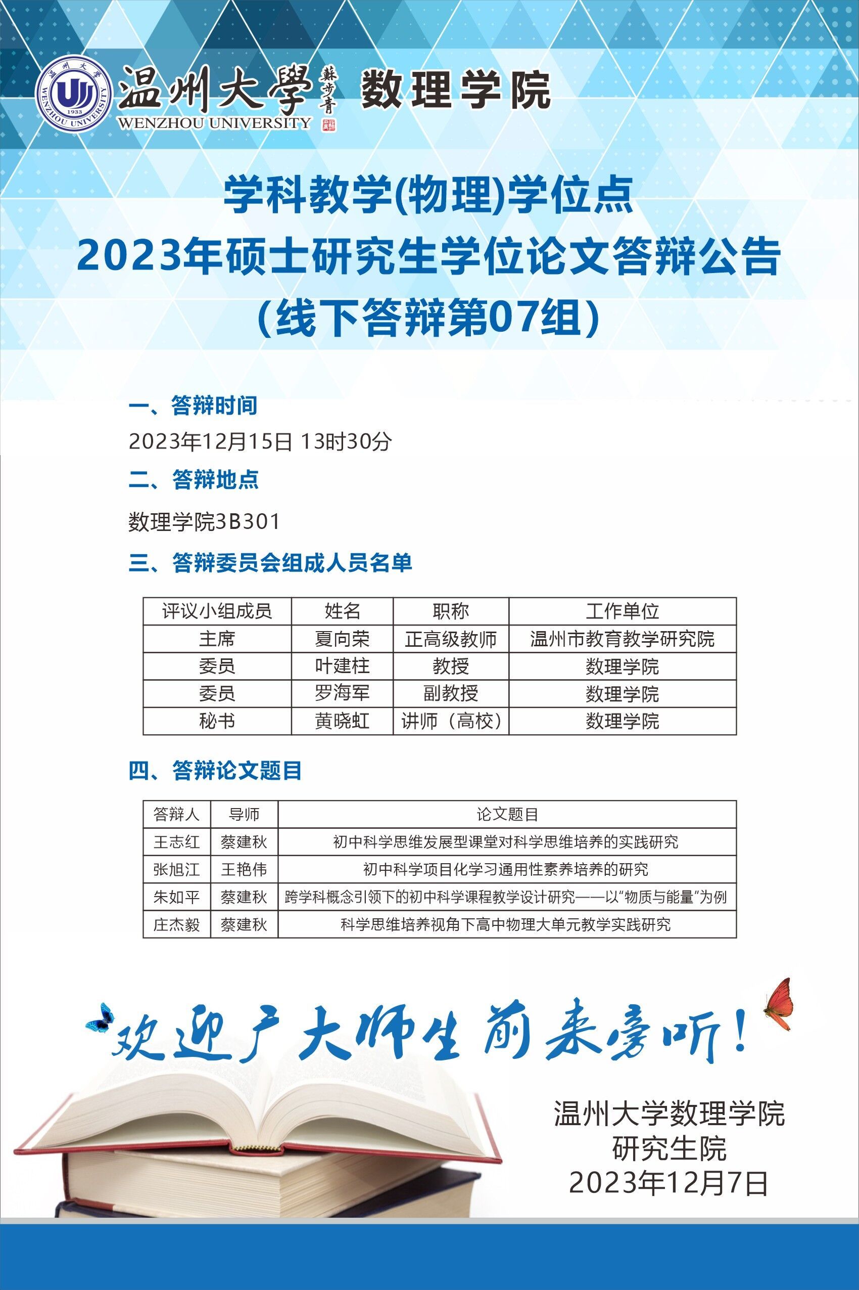 37000gcom威尼斯学科教学(物理)学位点2023年硕士研究生学位论文答辩公告