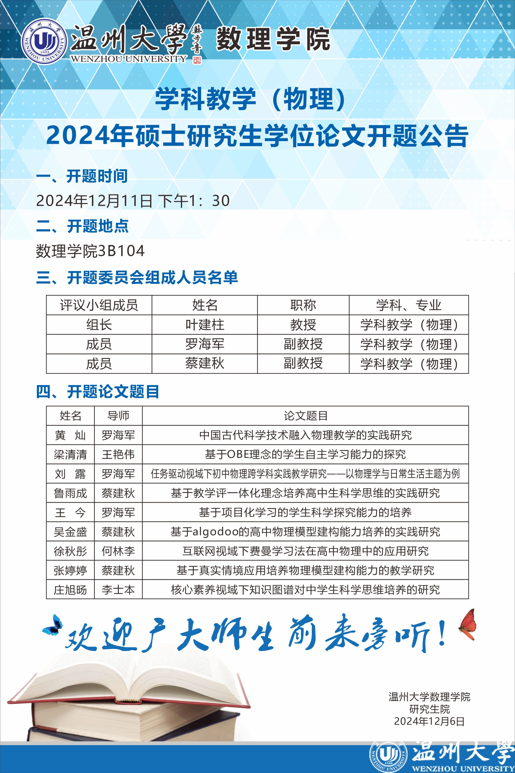 37000gcom威尼斯2023级学科教学(物理)专业型硕士研究生学位论文开题报告信息公告