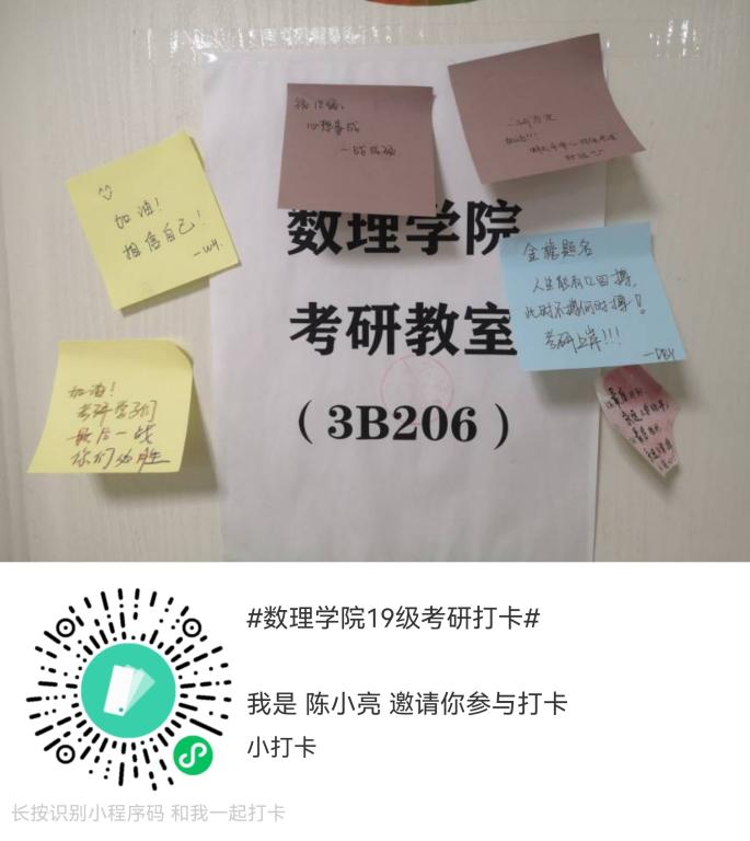 3.将每日学习内容手写提纲拍照上传“数理19级考研打卡圈”。学习内容需要与考研科目相关,包含专业课、高等数学、英语等。每日上传后,请截图留存,以备后用。