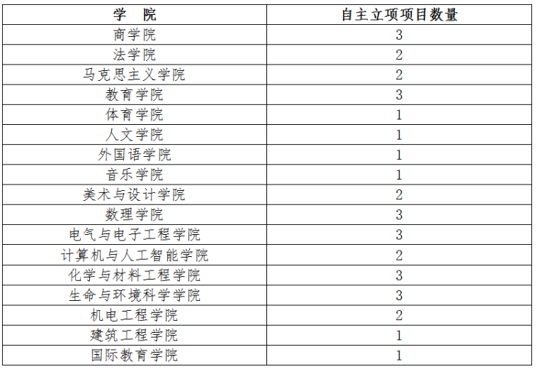 3、综合考虑“挑战杯”历年成绩、学校高峰学科建设,酌情给予各学院不等数量的自主立项项目数量,详见下表。