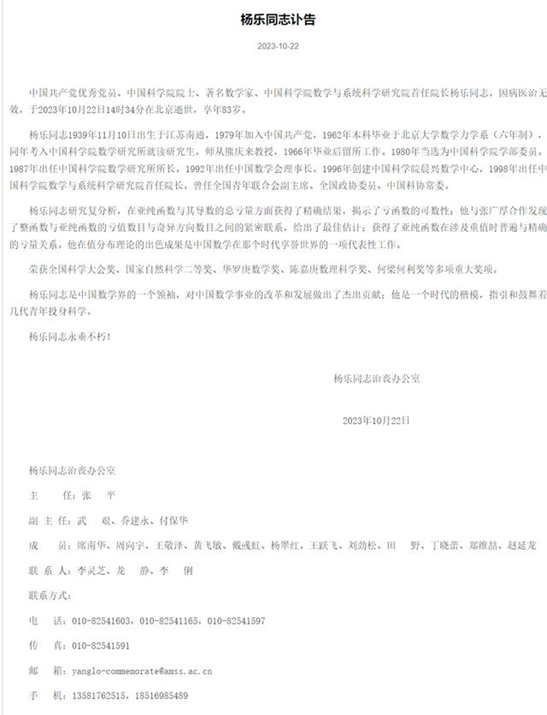 10月22日,中国科学院数学与系统科学研究院发布讣告,中国共产党优秀党员、中国科学院院士、著名数学家、中国科学院数学与系统科学研究院首任院长杨乐同志,因病医治无效,于2023年10月22日14时34分在北京逝世,享年83岁。