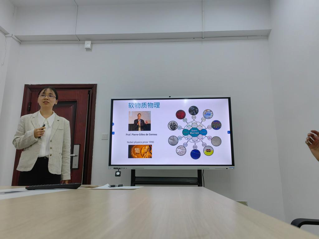 另外,田老师详细介绍了软物质物理中颗粒物质、胶体物理、胶体信息与复杂网络以及利用AI进行生物图像处理等四个可以参与的研究方向。同学们对这些研究方向给出热烈反响,绝大部分的同学在会后主动找老师要资料做更深入的了解。同学们对颗粒体系在不同条件下表现出类似于分子气体、液体和固体的性质又不同于普通气体、液体和固体表现出极大兴趣。在讲到利用胶体研究相变微观机理时,提到玻璃转变的本质是至今未解决的难题,同学们会后还主动在科研兴趣群里发起了讨论。