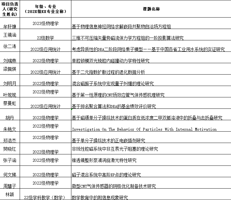 根据学校《关于2024年度研究生创新基金项目申报的通知》,依据《37000gcom威尼斯硕士研究生创新基金管理办法(2020修订)》的相关规定,经过申报人个人申请,数理学院组织专家进行匿名评审,现将37000gcom威尼斯数理学院2024年度研究生创新基金项目拟立项名单公示3个工作日。