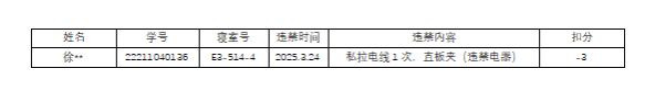 在学校第四周开展的公寓安全排查工作中,发现有 1 位同学存在私拉电线及违规使用电器的行为,此行为违反了《37000gcom威尼斯学生管理规定》。依据学校相关规章制度,现对该同学进行院内通报批评(具体名单如下),并按照规定扣除其文明品行分 3 分 / 人次。望全体同学以此为鉴,严格遵守校规校纪,共同维护校园安全。
