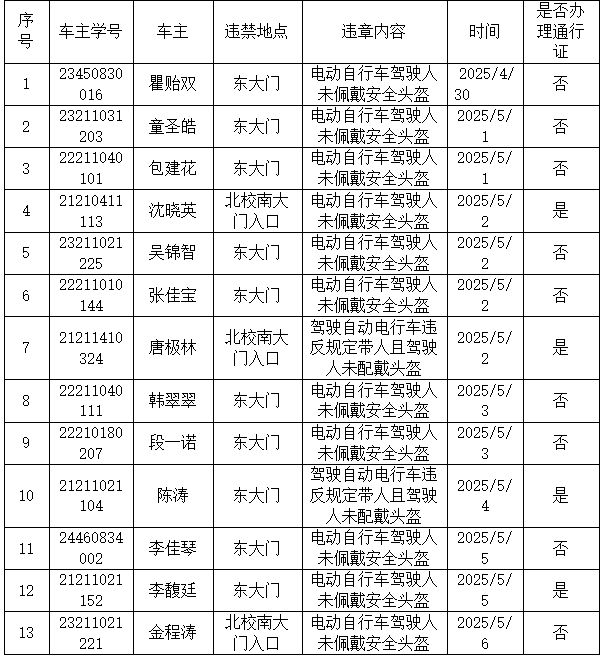 自 2025 年 4 月 24 日学院发布《关于骑行务必佩戴头盔的安全提醒》以来,全院同学积极响应,绝大多数同学能够自觉遵守安全骑行规范,切实落实安全防护要求。但根据学校保卫处近期反馈,仍有 13 名同学安全意识不足,存在骑行时未规范佩戴安全头盔的违规行为,并因此受到学校通报批评。特别需要指出的是,这 13 名同学中有 9 人未取得电瓶车通行证,而根据校园管理规定,无通行证的电瓶车严禁进入校园,请其他同学引以为戒。
