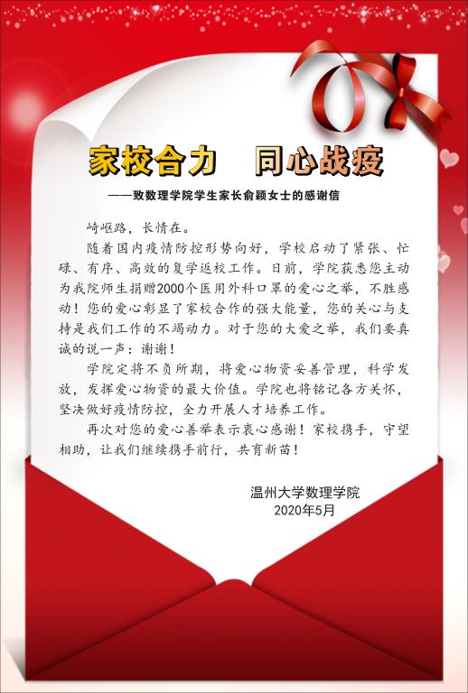 随着国内疫情防控形势向好,学校启动了紧张、忙碌、有序、高效的复学返校工作。日前,学院获悉您主动为威尼斯官网师生捐赠2000个医用外科口罩的爱心之举,不胜感动!您的爱心彰显了家校合作的强大能量,您的关心与支持是我们工作的不竭动力。对于您的大爱之举,我们要真诚的说一声:谢谢!