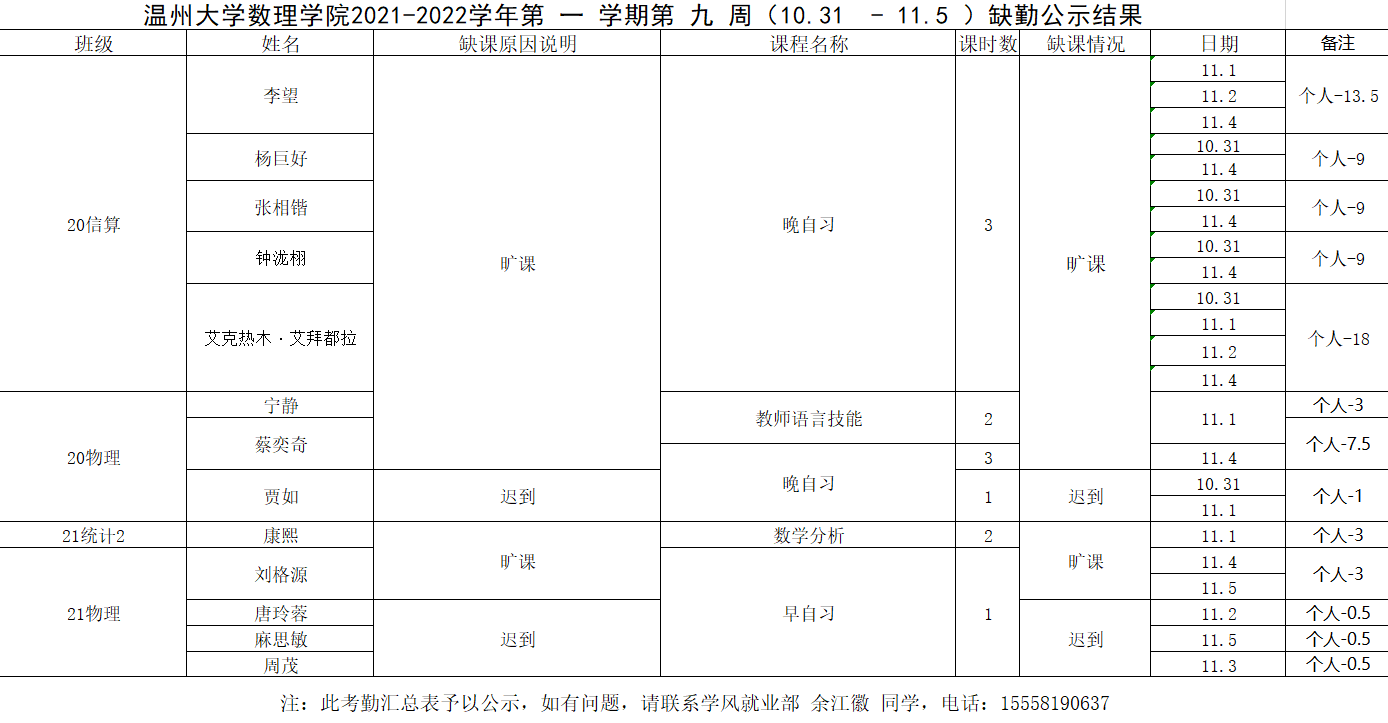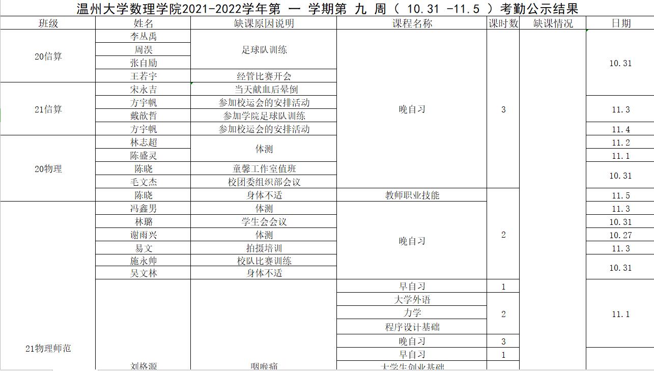 37000gcom威尼斯2021-2022学年第一学期第九周(10.31-11.5)考勤公示结果