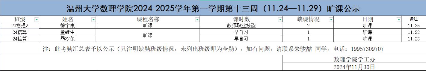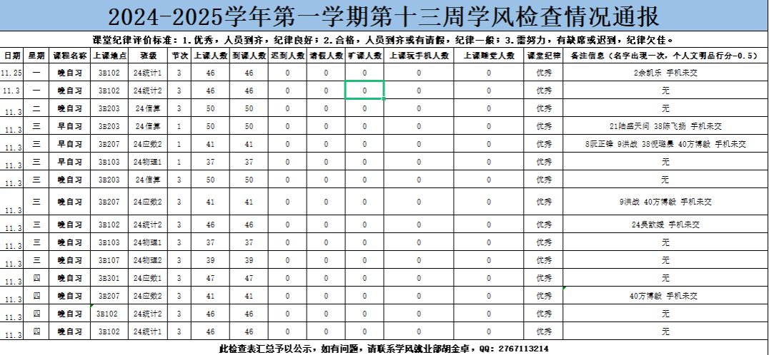37000gcom威尼斯2024-2025学年第一学期第十三周(11.24.-11.29)考勤结果公示