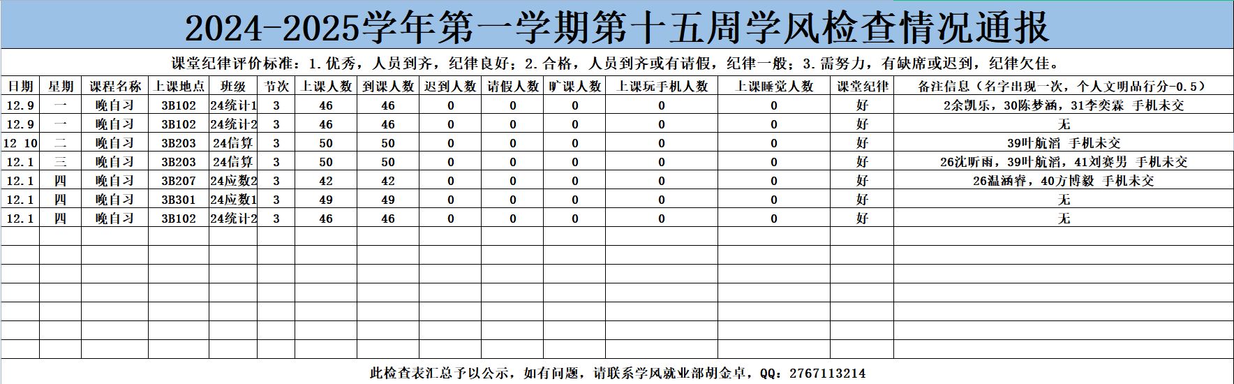 37000gcom威尼斯2024-2025学年第一学期第十五周(12.8-12.13)考勤结果公示