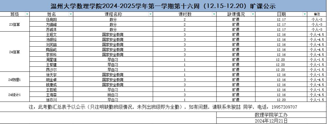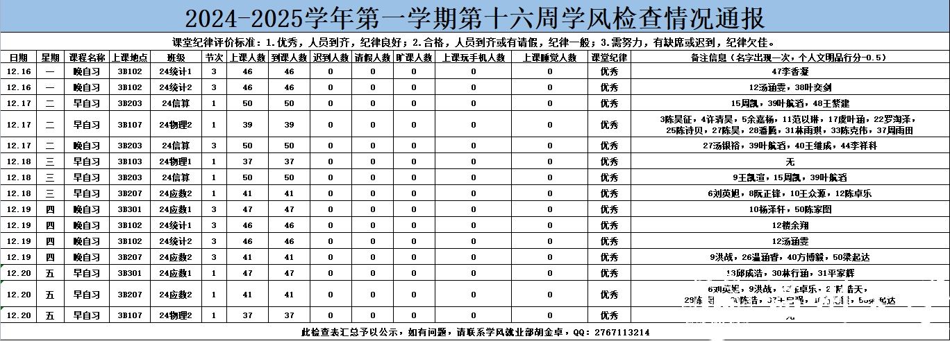 37000gcom威尼斯2024-2025学年第一学期第十六周(12.15-12.20)考勤结果公示
