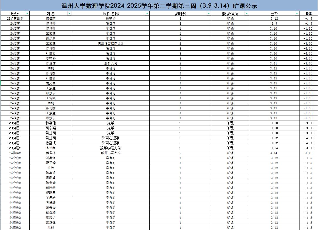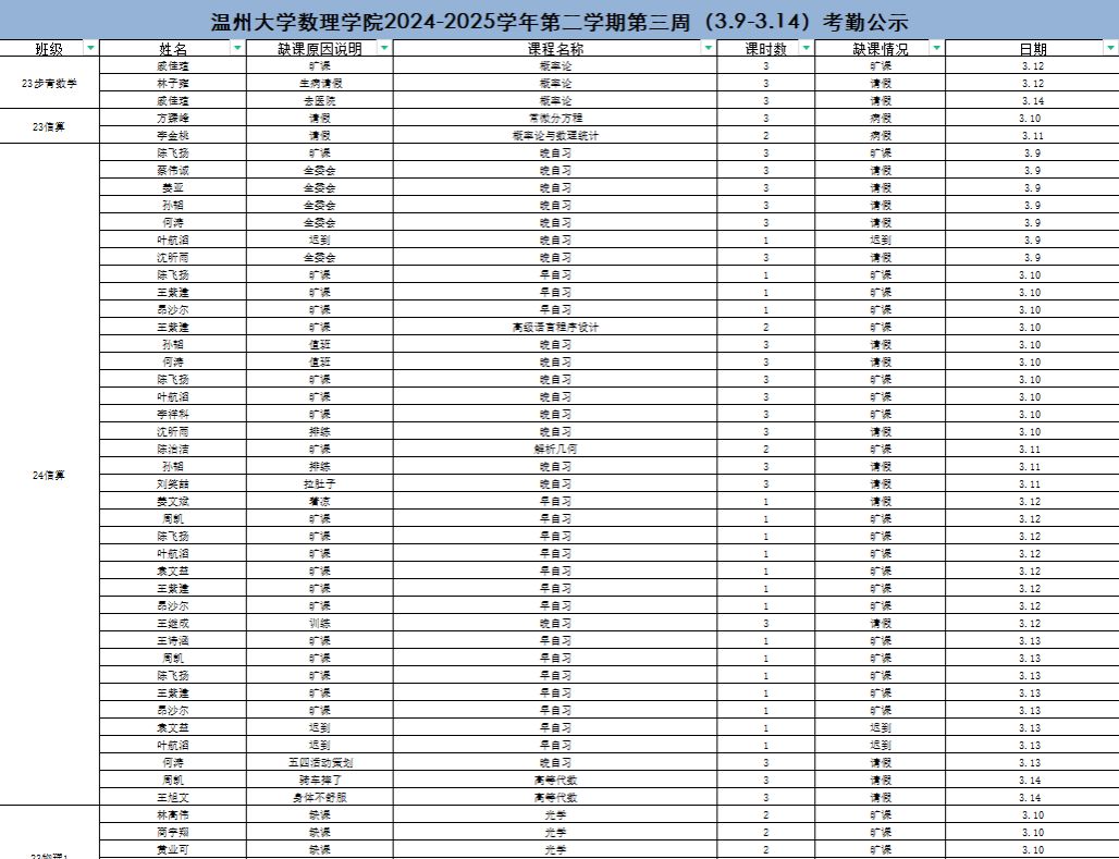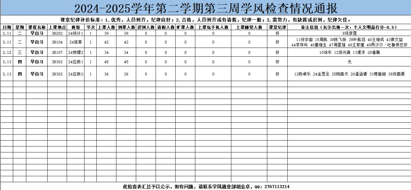 37000gcom威尼斯2024-2025学年第二学期第三周(3.9-3.14)考勤结果公示