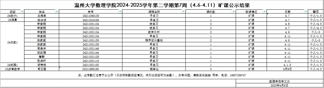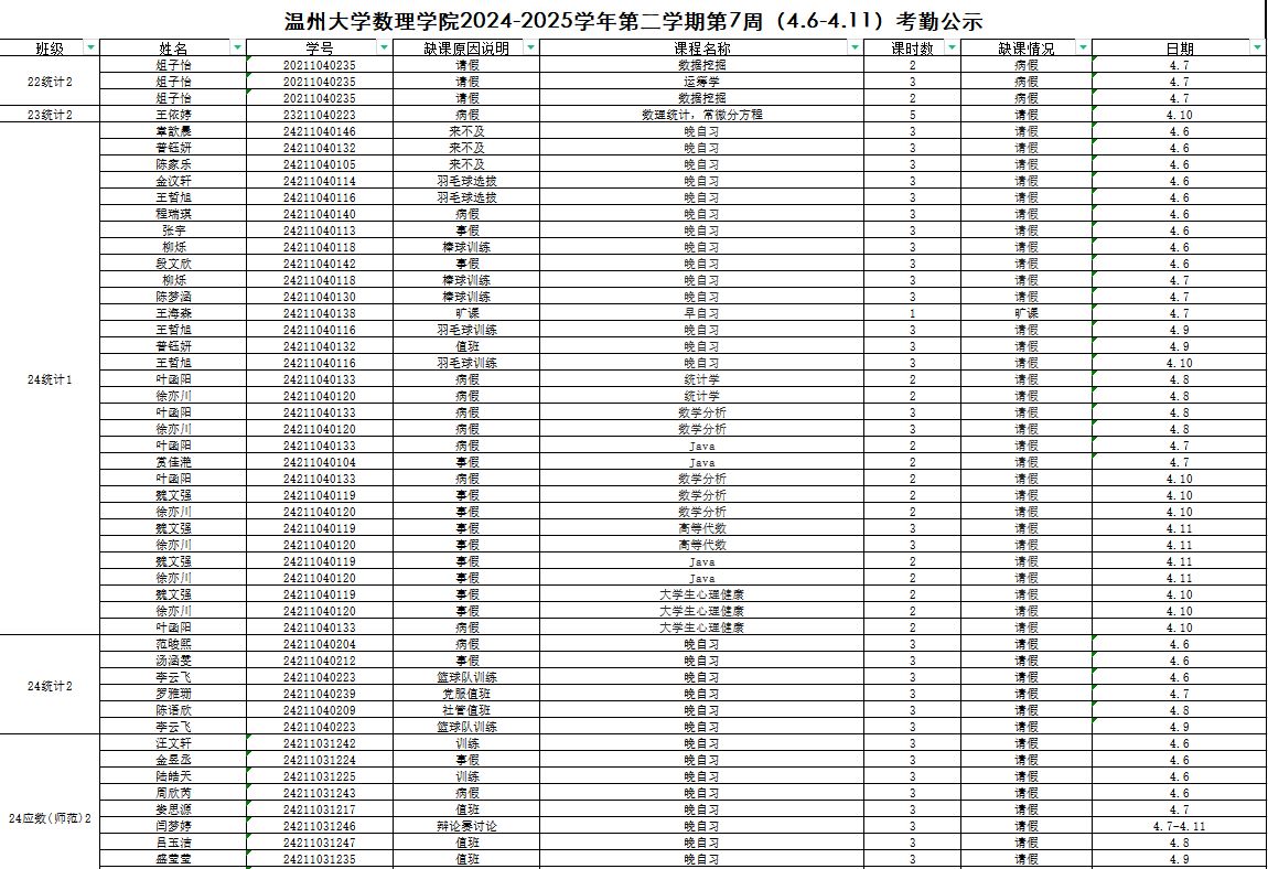 37000gcom威尼斯2024-2025学年第二学期第七周(4.6-4.11)考勤结果公示