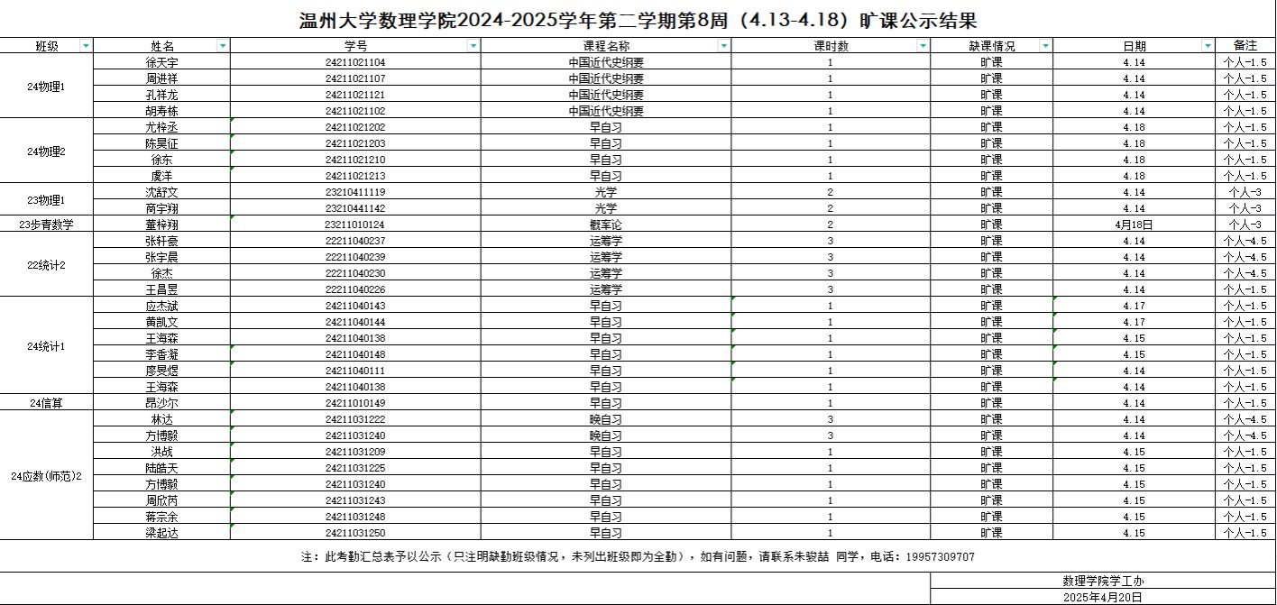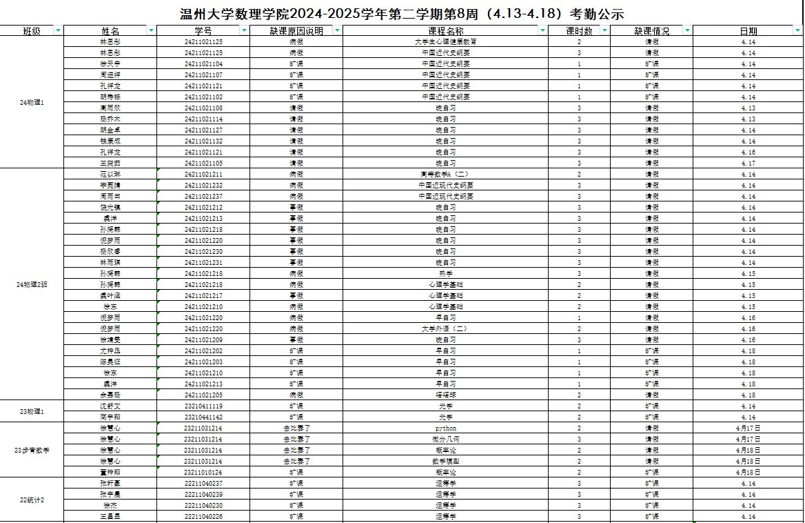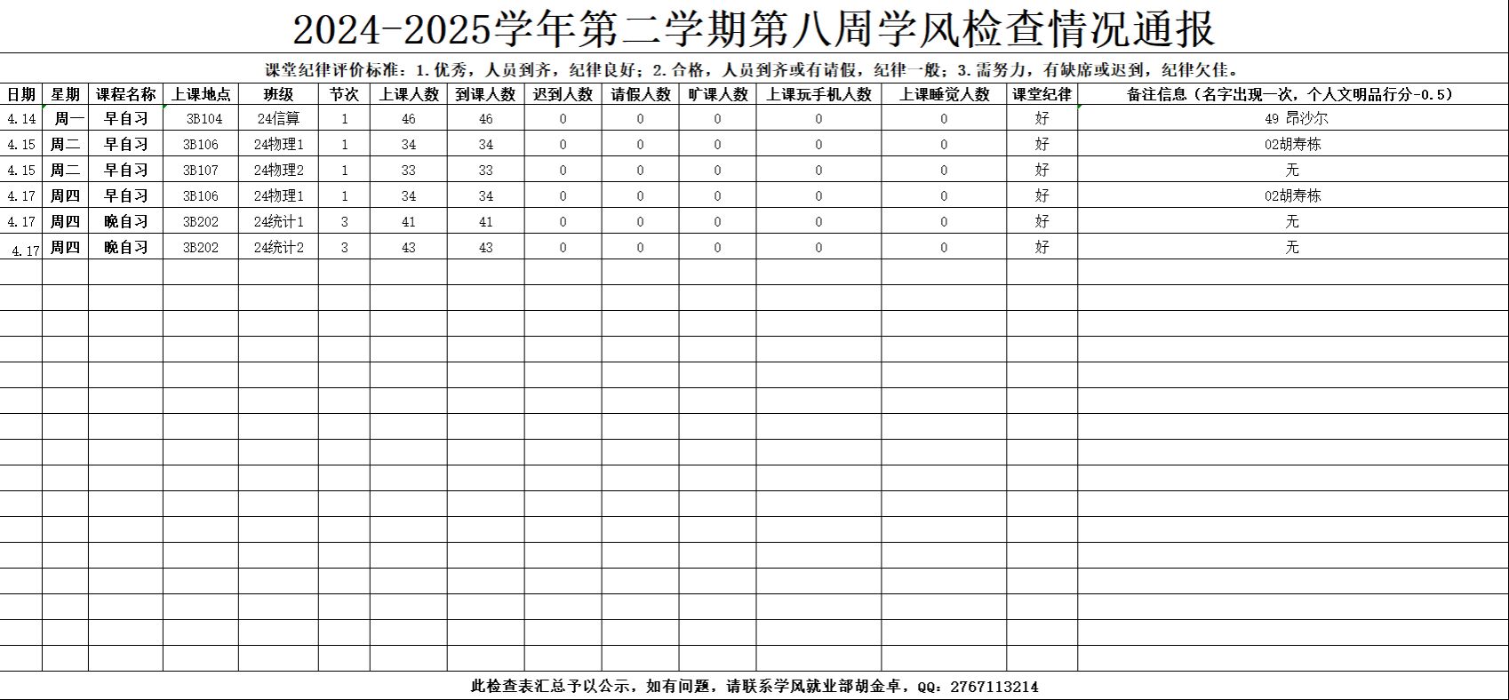 37000gcom威尼斯2024-2025学年第二学期第八周(4.13-4.18)考勤结果公示