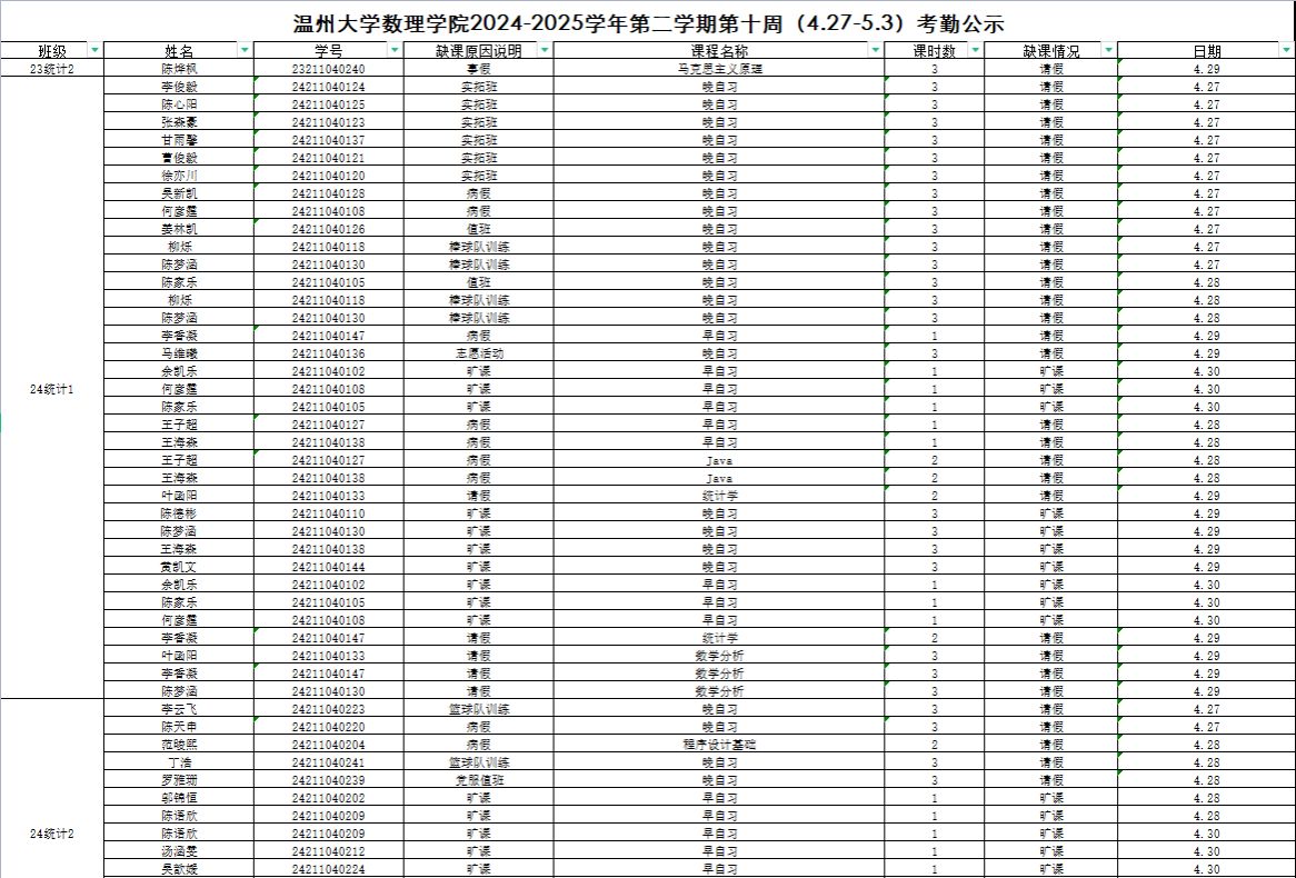 37000gcom威尼斯2024-2025学年第二学期第十周(4.27-5.3)考勤结果公示