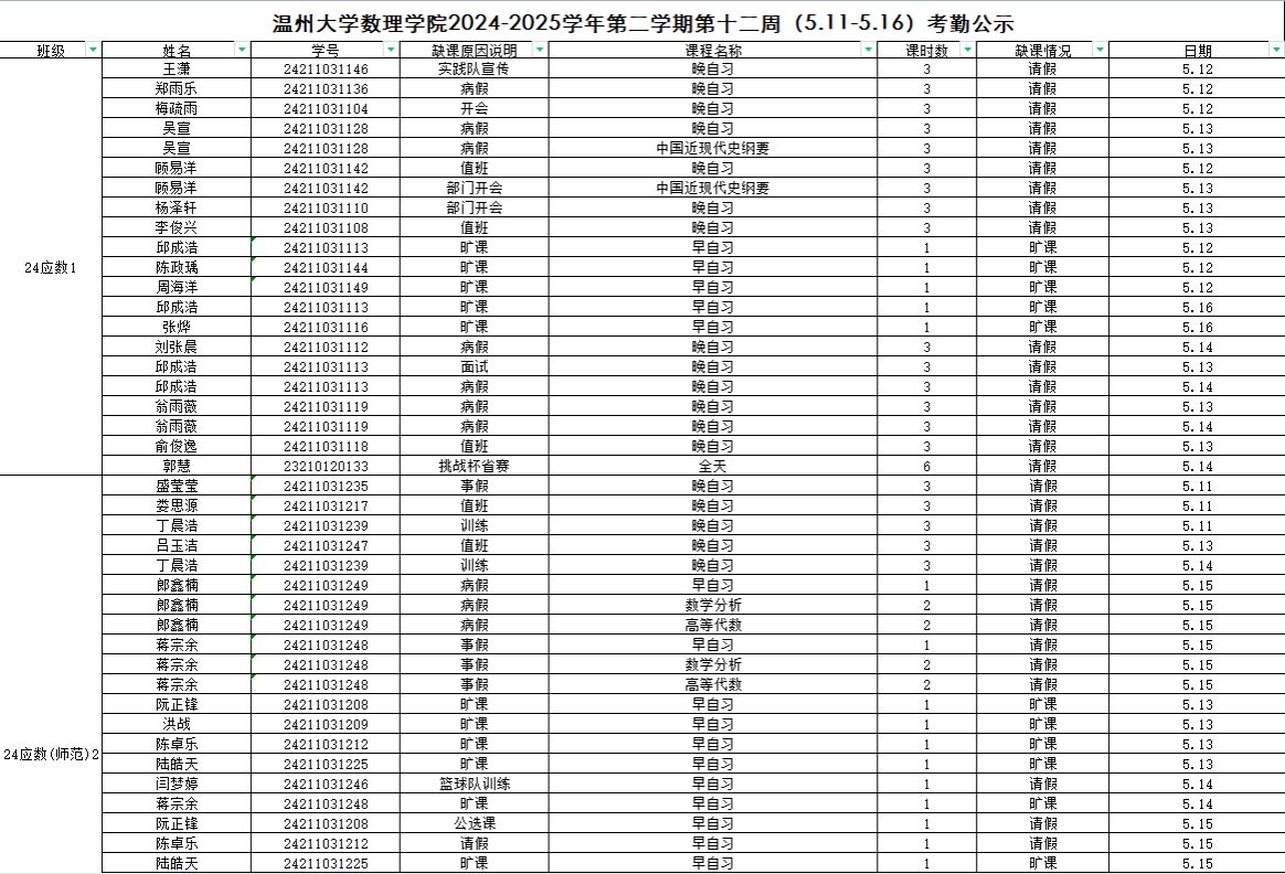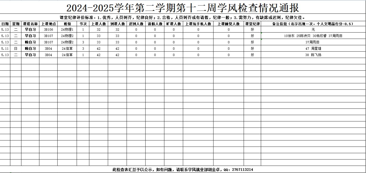 37000gcom威尼斯2024-2025学年第二学期第十二周(5.11-5.16)考勤结果公示