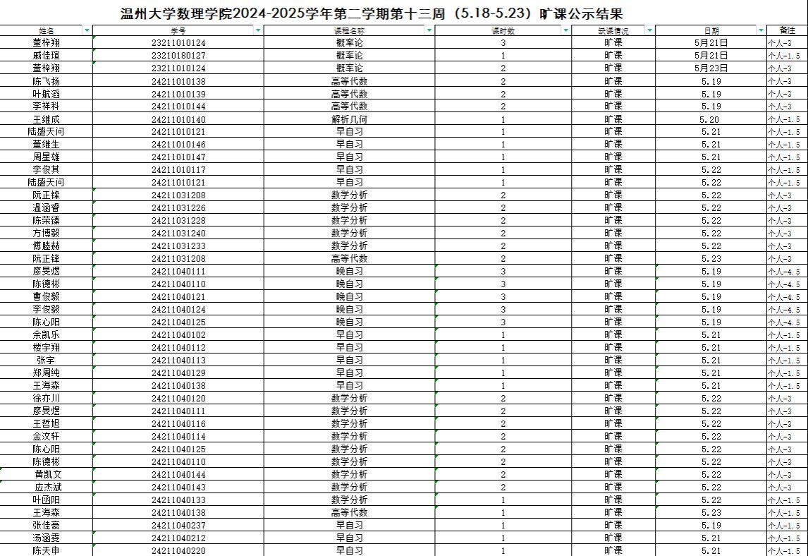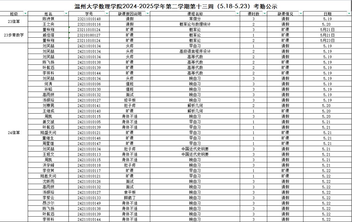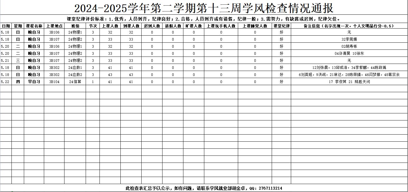 37000gcom威尼斯2024-2025学年第二学期第十三周(5.18-5.23)考勤结果公示