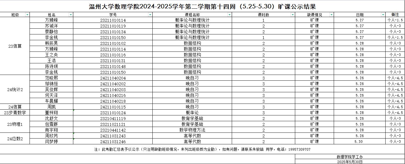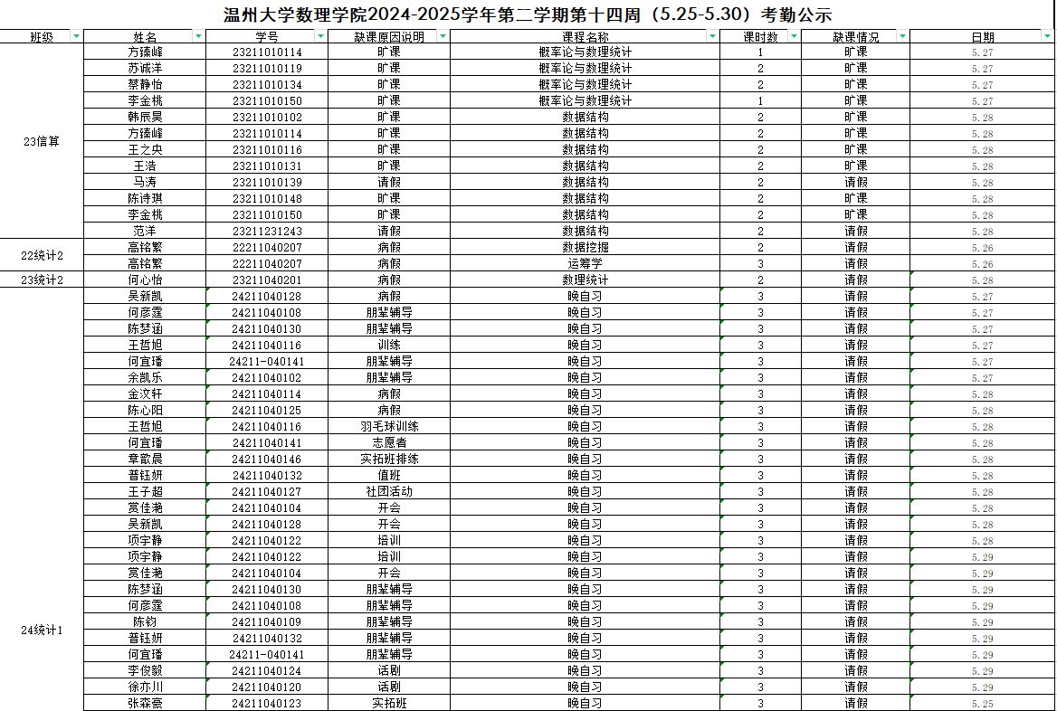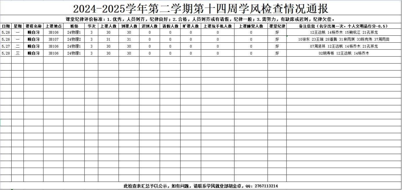 37000gcom威尼斯2024-2025学年第二学期第十四周(5.25-5.30)考勤结果公示