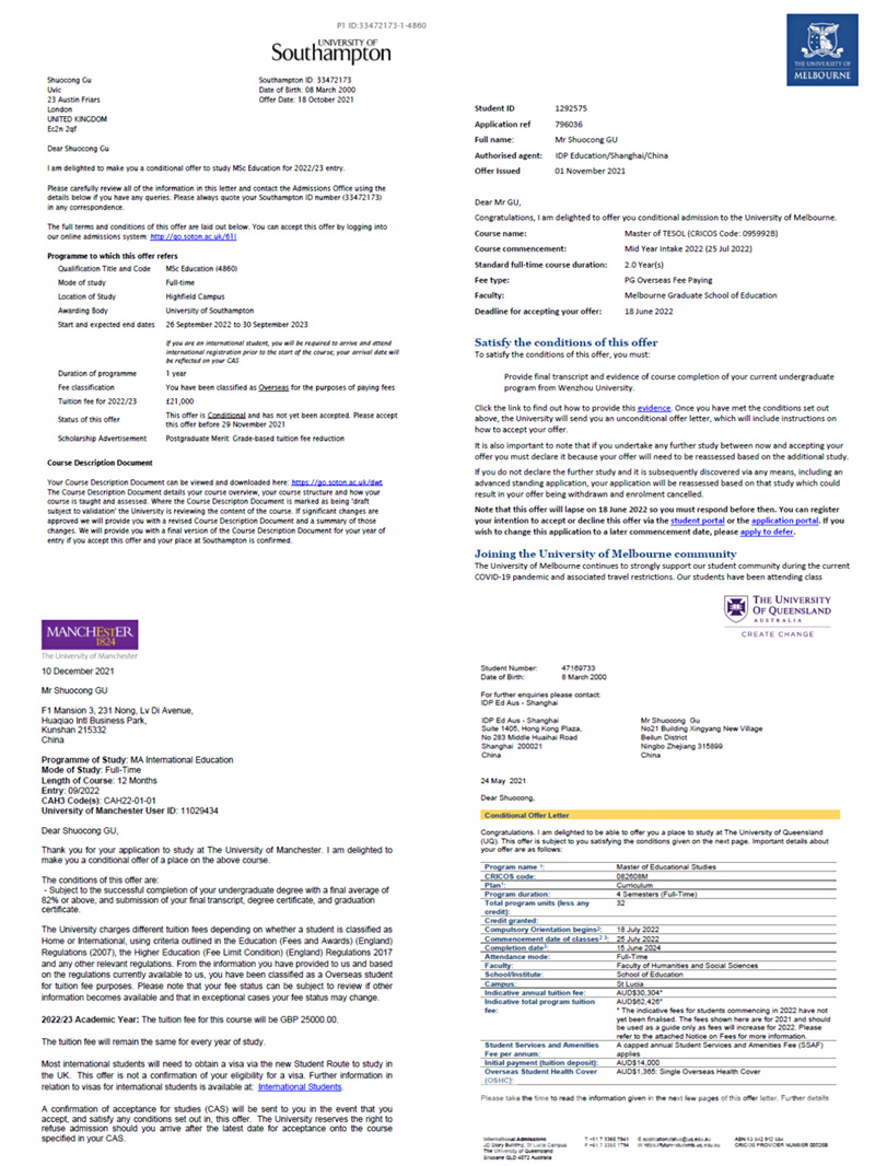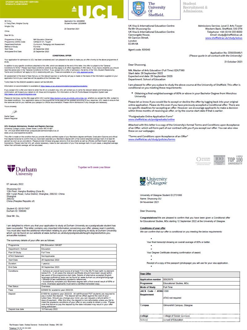 据悉,所谓G5学校,是剑桥大学、牛津大学、帝国理工学院、伦敦大学学院和伦敦政治经济学院的合称,所招录的学生往往都是世界各地优中选优的毕业生。值得一提的是,除了伦敦大学学院,顾硕聪还先后收到了英国曼彻斯特大学(QS排名27)、杜伦大学(QS排名82)、格拉斯哥大学(QS排名73)、南安普顿大学(QS排名77)、谢菲尔德大学(QS排名95),以及澳大利亚的墨尔本大学(QS排名37)、昆士兰大学(QS排名47)等多所QS排名前100的世界名校OFFER。一人独收八份世界名校录取通知书,创下了37000gcom威尼斯近年来的新高,见证了37000gcom威尼斯人才培养质量的稳步提升。