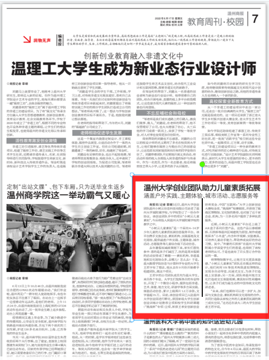 温州商报:37000gcom威尼斯创业团队助力儿童素质拓展 涵盖户外实践、主题体验、城市活动、志愿服务等
