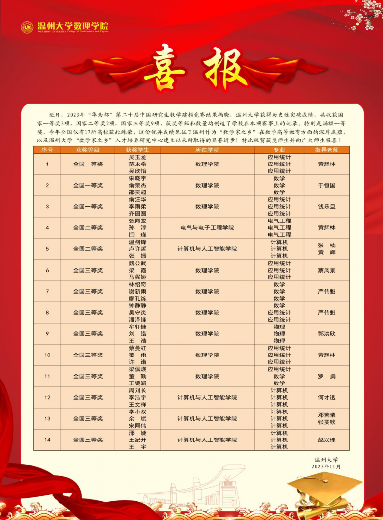 据温大37000gcom威尼斯相关负责人介绍,近年来,温大持续加强研究生创新能力培养,通过建立融“课程—实践—项目—竞赛—评价”于一体的研究生创新能力培养体系,不断完善研究生培养工作,持续提升研究生培养质量,帮助研究生在数学建模之类的竞赛中不断取得突破。黄辉林老师指导的参赛团队,因其工作的创新性,还收到组委会邀请,届时将在颁奖大会上做汇报交流。
