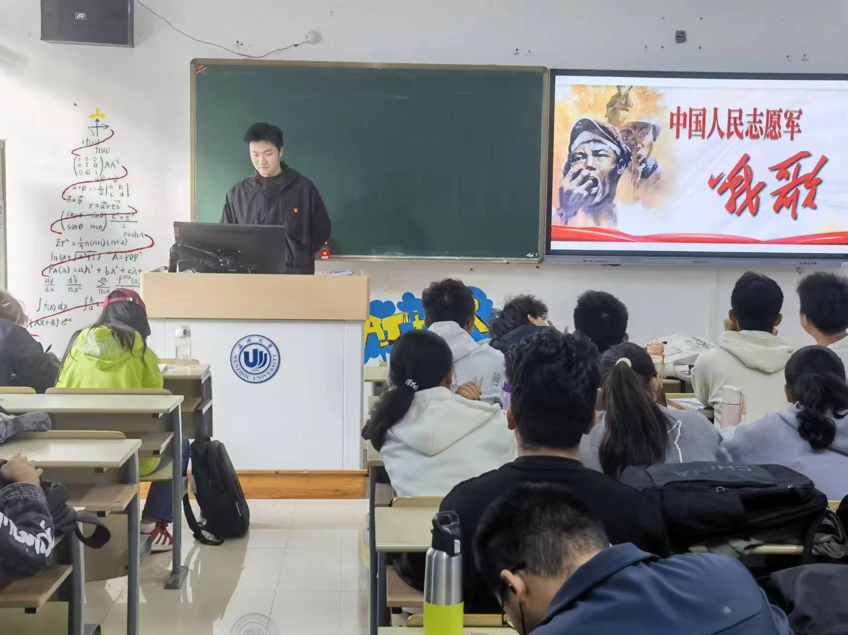 “雄赳赳,气昂昂,跨过鸭绿江。保和平,卫祖国,就是保家乡。”教室里传出了雄壮的歌声,这是退伍大学生党员在教同学们唱《中国人民志愿军战歌》。