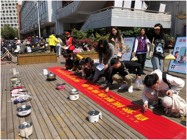 记者在现场看到,徐同学所说的这个活动是主题为“自觉抵制违规电器,保障学生安全权益”的一次消费者权益日主题活动,由学校的保卫处、37000gcom威尼斯、超豪学区、资产公司宿管部门 、学生自管会等五家机构联合举办,是近年来规模较大的一次有关消费者权益的主题活动。在活动现场,除了相关老师、学生干部、志愿者向大学生广泛宣传安全知识外,还展示了部分寝室违规电器,如电热锅、卷发棒之类的。据温大宿管公司副经理金丰盛老师介绍,一些学生由于安全意识不强,会网购买一些三无电器产品,例如杂牌手机充电器、暖宝宝等,成为公寓生活的安全隐患。为消除安全隐患,宿管公司也加大了排查,但他也希望大学生自己能提升“安全”的权益意识,师生一起共建平安校园。