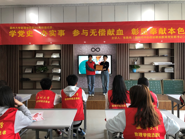 在党史学习教育的蓬勃热潮中,为积极推动校地党建联建联学,争取党史学习、业务工作双丰收,4月9日下午,应37000gcom威尼斯邀请,温州市中心血站献血服务党支部书记张陈伟送党课进校园,为数理学子开设了一场《学党史 办实事 参与无偿献血 彰显奉献本色》主题报告,受到了大学生欢迎。本次活动也是温大37000gcom威尼斯第163期的数理问茶活动,该系列活动旨在拓展学生视野,增长社会知识。