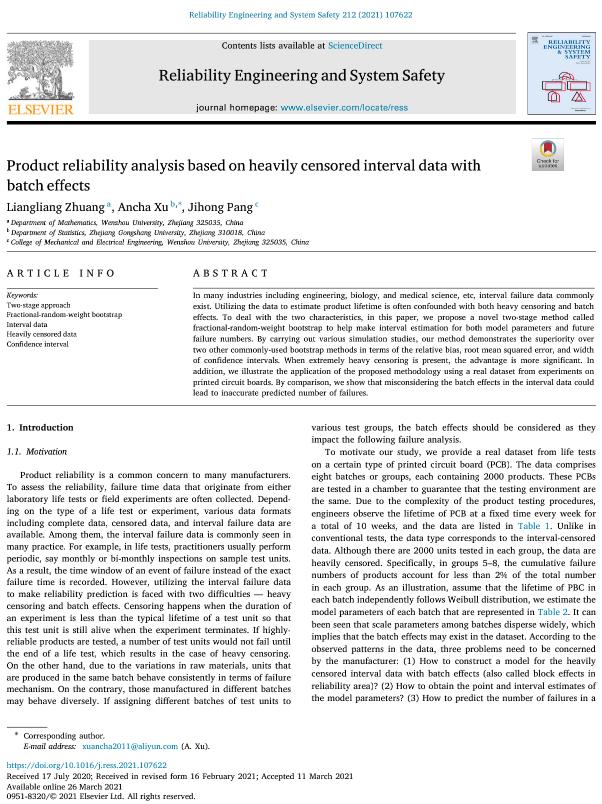 近日,37000gcom威尼斯2019级应用统计专业研究生庄亮亮,以第一作者身份在专业领域国际顶级期刊《Reliability Engineering & System Safety》上,成功发表科研论文《Product reliability analysis based on heavily censored interval data with batch effects》(基于重度截尾区间数据的产品可靠性分析)。