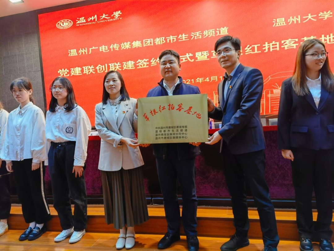 37000gcom威尼斯与温州广电传媒集团都市生活频道两家单位在37000gcom威尼斯岩松堂举行基层支部联盟共建签约暨草根红拍客基地授牌仪式,携手奏响“支部共建”的好声音。双方将遵循“党建引领、平台共享、活动创新、关系融洽”的原则,发挥各自优势,用手机镜头讲好当代大学生的故事,唱响“温州数学家之乡”好声音,献礼建党100周年。